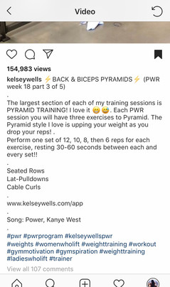 Kelsey Wells has been a very influential figure on Instagram in the fitness world, particularly for women. She has 1.6 million followers, and has partnered with other fitness programs and trainers such as Kayla Itsines and the SWEAT program. Kelsey also has her own program called PWR that focuses primarily on weight training.